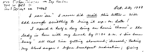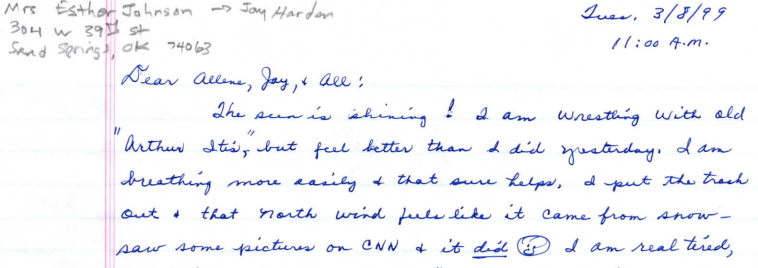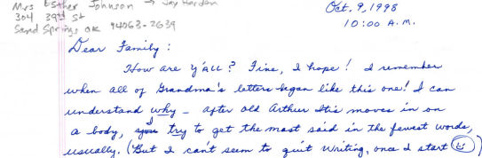 In 1971 Esther wrote a letter to Aline Harden, and said Kathy had asked about family so she'd write for a while; she also included two separate notes about Dora and Joel Moore.